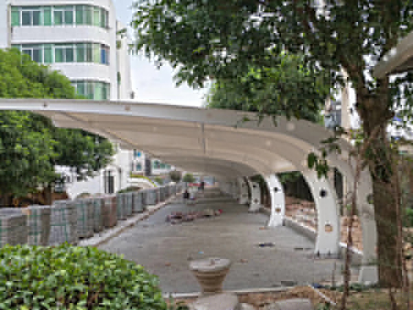 3、膜結(jié)構(gòu)停車棚頂部封板采用茶色(顏色可挑選)陽光板封頂,與車棚整體骨架用壓條鉚接固定,耐酸堿腐蝕,有足夠強度對棚內(nèi)車輛起到保護作用。