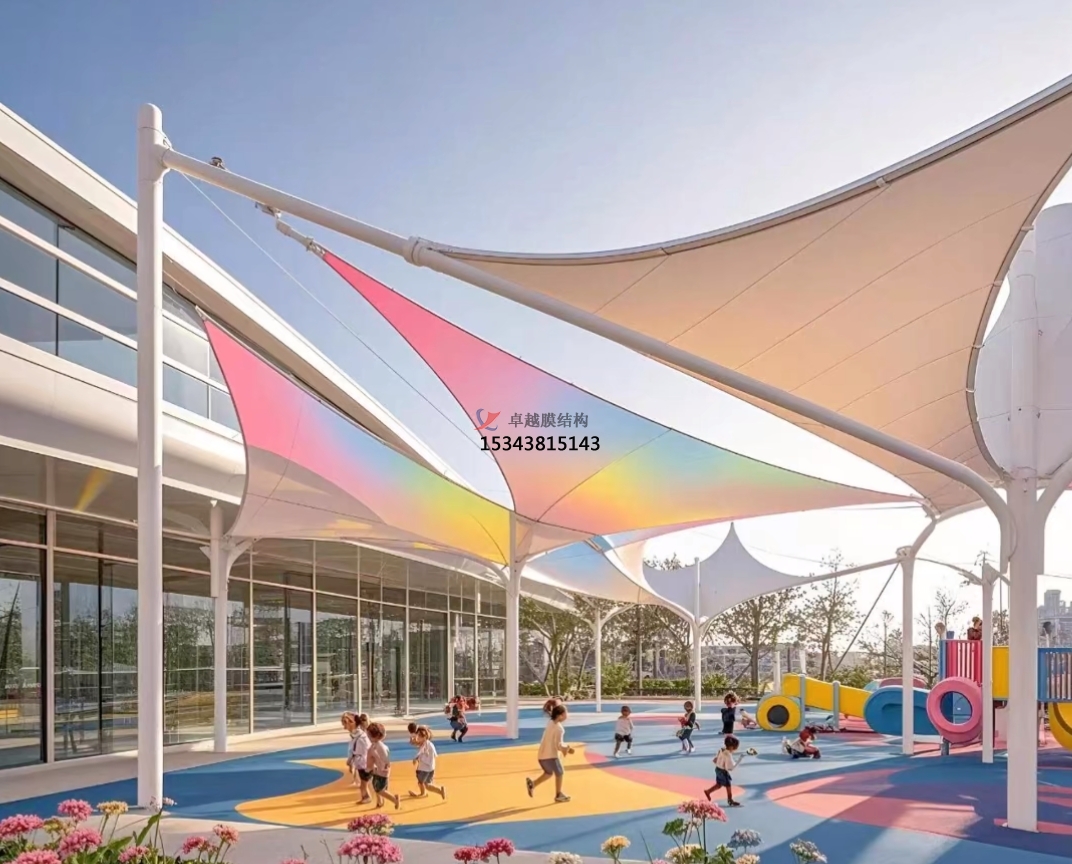 膜材料具有良好的透光性,可以在保證遮陽的同時,讓自然光線柔和地灑入室內(nèi),為孩子們提供充足的日照,有利于他們的視力保護和身心健康。同時,膜結(jié)構(gòu)的設計通常結(jié)合高效的通風系統(tǒng),確保室內(nèi)空氣流通,即使在炎熱的夏季也能保持室內(nèi)涼爽,為孩子們創(chuàng)造一個舒適的學習環(huán)境。