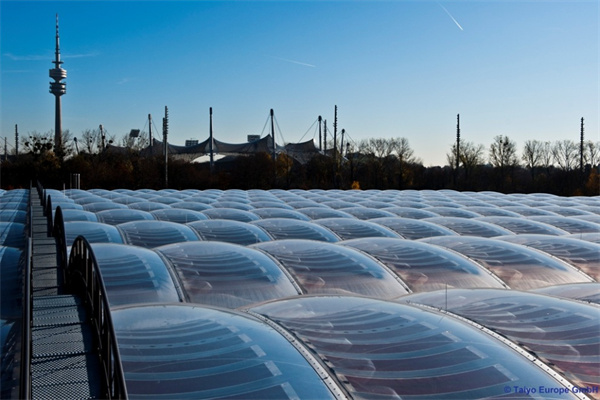 卓越的透光性 – ETFE薄膜可以高度透明,并允許紫外線通過,紫外線負(fù)責(zé)促進(jìn)光合作用,從而促進(jìn)植物生長(zhǎng)。太陽能控制/遮陽 – ETFE薄膜系統(tǒng)可在一層或多層上加入多種玻璃料圖案,以改變其太陽能性能。箔片印有各種標(biāo)準(zhǔn)或定制圖案。顏色可以通過各種方式引入,無論它是在薄膜擠出過程中應(yīng)用,提供從紅色到紫色的各種色調(diào)的一致色調(diào),或添加無限顏色選項(xiàng)的照明。彈性 – 雖然ETFE薄膜非常有彈性,但它們?nèi)跃哂薪Y(jié)構(gòu)抗性。彈性/塑性極限的拉伸強(qiáng)度為21-23N /mm 2,但斷裂點(diǎn)的拉伸強(qiáng)度為52/Nmm 2。對(duì)于膜結(jié)構(gòu)計(jì)算,通常保守地采用15 N /mm的極限。持久耐用 – 長(zhǎng)期暴露于環(huán)境污染,紫外線,刺激性化學(xué)品或極端溫度變化,ETFE不會(huì)降解。聲學(xué) – ETFE薄膜具有大約70%的聲學(xué)傳輸可持續(xù)/節(jié)能 – 從薄膜的擠出到運(yùn)輸?shù)浆F(xiàn)場(chǎng),與其他類似的包覆材料相比,消耗的能量很少,從而減少了整體碳足跡。除此之外,產(chǎn)品的性質(zhì)通過隔熱和采光增強(qiáng)了建筑物理,從而有助于建筑的全球低能耗。成本效益 – 由于ETFE的輕質(zhì)特性,可以更有效地設(shè)計(jì)下部結(jié)構(gòu)支撐系統(tǒng)和混凝土基礎(chǔ)。ETFE系統(tǒng)還提供充足的自然采光,從而通過降低對(duì)室內(nèi)照明的需求來更小化能源成本??苫厥?– 易于回收利用,來自制造過程的廢棄物甚至舊的ETFE元件可以重新制成新的ETFE產(chǎn)品,如管道部件,電線或鑄件。