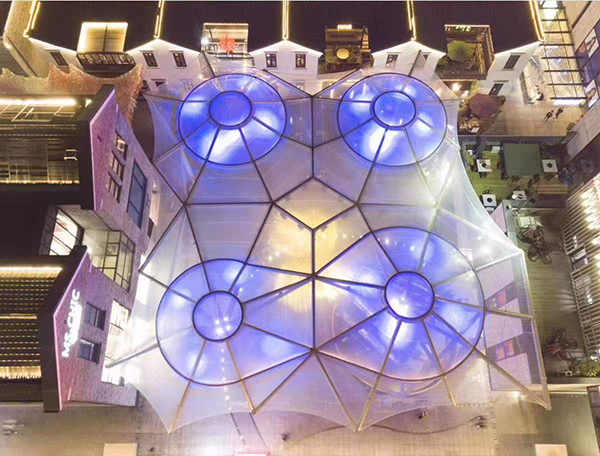 ETFE膜材通常為無色透明狀,也可以做成白色。根據(jù)需要可在透明或白色膜材上印制各種圖案。以0.20mm厚的ETFE膜材為例,單層透明膜材的透光率高達(dá)95%,白色膜材為50%~55%。利用白色膜材或在透明膜材上印制不同的顏色和圖案,可調(diào)節(jié)進(jìn)入建筑物內(nèi)的光線。