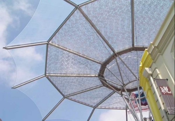 ETFE薄膜常被制作成雙層或多層氣枕的形式而應(yīng)用于膜結(jié)構(gòu)建筑中,即將ETFE薄膜按照建筑師設(shè)計的形狀(可以是圓形、橢圓形、三角形、矩形、多邊形或其他任意形狀)剪裁、焊接,通過鋁合金或輕質(zhì)鋼材的邊框構(gòu)件將各獨立氣枕連接在一起形成一個大覆蓋空間。每個獨立氣枕帶有供氣系統(tǒng)與充氣設(shè)備相連,氣枕內(nèi)部維持一定的氣體壓力起到保持氣枕形狀、承載及傳遞外部載荷、隔熱、隔音、調(diào)節(jié)建筑內(nèi)部光線等功能以滿足建筑物理學的需要。