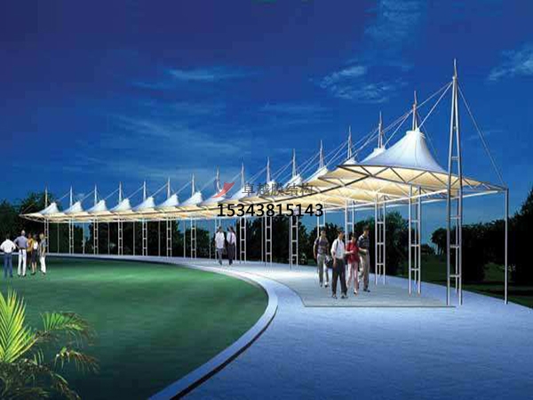 (2)膜結(jié)構(gòu)藝術(shù)性。膜結(jié)構(gòu)突破了傳統(tǒng)的建筑結(jié)構(gòu)類型,以造型學(xué)、色彩學(xué)為依托,可結(jié)合自然條件,充分發(fā)揮建筑師的想象力,根據(jù)創(chuàng)意建造出傳統(tǒng)建筑難以實(shí)現(xiàn)的曲線及各種造型,且色彩豐富,富有時(shí)代氣息,體現(xiàn)結(jié)構(gòu)構(gòu)件受力之美。配合燈光易形成夜景,給人以現(xiàn)代美的享受。