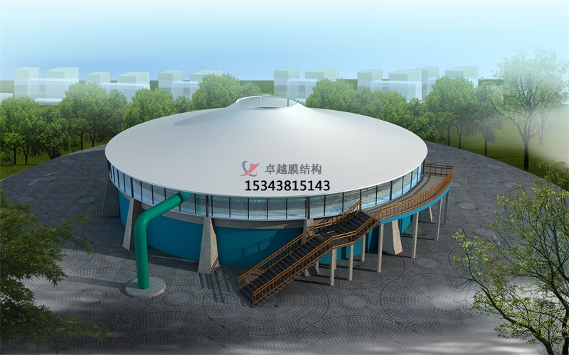 簡介:污水池膜結(jié)構(gòu)加蓋技術(shù)通常采用鋼支撐反吊UV膜結(jié)構(gòu),它的巧妙之處在于“反吊”,采用了抗腐蝕能力很強的UV膜材(氟碳纖膜)把廢氣罩住,鋼結(jié)構(gòu)在外面將膜懸吊,這種加蓋工藝可以解決鋼結(jié)構(gòu)由于與腐蝕性氣體接觸而帶來的腐蝕問題,發(fā)揮了鋼結(jié)構(gòu)的性能,實現(xiàn)了結(jié)構(gòu)骨架與覆蓋材料的完美結(jié)合。