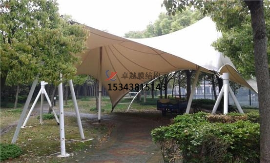 張拉膜景觀遮陽棚具有較好的隔熱效果,對太陽熱能可反射掉70%,膜材本身吸收了17%,傳熱13%,而透光率卻在20%以上,經(jīng)過10年的太陽光直接照射,其輝度仍能保留70%.這與它本身的材質(zhì)有關(guān)系。