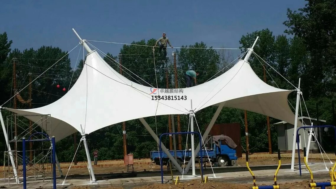膜結(jié)構(gòu)遮陽(yáng)棚結(jié)構(gòu)設(shè)計(jì):其結(jié)構(gòu)設(shè)計(jì)主要從找形分析、荷載計(jì)算、支撐體系、形態(tài)創(chuàng)新、膜材選擇等方面出發(fā)。找形分析,通過(guò)力密度法、動(dòng)力松弛法或非線性有限元法確定膜材空間形態(tài),確保合理受力分布與美學(xué)效果。荷載計(jì)算,重點(diǎn)考慮風(fēng)荷載、雪荷載及自重,采用有限元法進(jìn)行靜力與動(dòng)力分析,避免膜面受壓或局部應(yīng)力集中。支撐體系,選擇合適的支撐結(jié)構(gòu)形式,如鋼結(jié)構(gòu)、鋁合金結(jié)構(gòu)等。支撐結(jié)構(gòu)應(yīng)具有足夠的強(qiáng)度、剛度和穩(wěn)定性,能夠可靠地承受膜面?zhèn)鱽?lái)的荷載。常見的支撐方式有立柱支撐、懸索支撐、框架支撐等。形態(tài)創(chuàng)新,結(jié)合曲線、弧線等元素,設(shè)計(jì)可調(diào)節(jié)遮陽(yáng)棚,適應(yīng)不同光照與使用需求。半透明膜材與光影結(jié)合,營(yíng)造柔和氛圍,兼具遮陽(yáng)與景觀功能。膜材選擇,根據(jù)遮陽(yáng)棚的使用要求和環(huán)境條件,選擇合適的膜材。膜材應(yīng)具有良好的耐久性、抗紫外線性能、自潔性能、防火性能等。常用的膜材有聚四氟乙烯(PTFE)膜、聚酯纖維基 PVC 膜、乙烯 - 四氟乙烯共聚物(ETFE)膜等。
