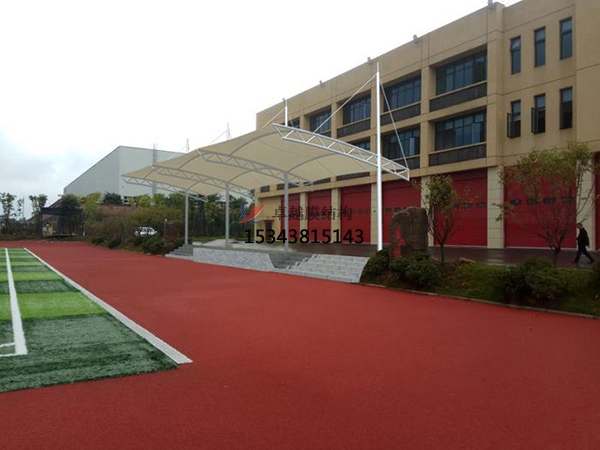 另外,膜材料的表面污染程度還與屋頂?shù)膬A斜角度有很大的關(guān)系,一般屋頂與水平面的角度越大越 容易變臟。傾斜角在0°~45°范圍之內(nèi)不易產(chǎn)生雨水痕跡,當(dāng)傾斜角超過65°時會出現(xiàn)雨水痕跡。一般膜結(jié)構(gòu)的側(cè)面多為90°,在使用過程中很難避免造成雨水痕跡。對膜材料自潔性的評價,是將 膜材料進(jìn)行室外暴曬試驗(yàn),然后用分光光度計(jì)測量暴曬前及暴曬后膜材料的可見光反射率,用得出 的色差(△E)來進(jìn)行評價。色差越小表示其自潔性越好。 自潔性膜結(jié)構(gòu)建筑不論是用于永jiu性建筑還是用于臨時性建筑,都要求使用的膜材料具有 自潔性,能保持建筑的美觀。