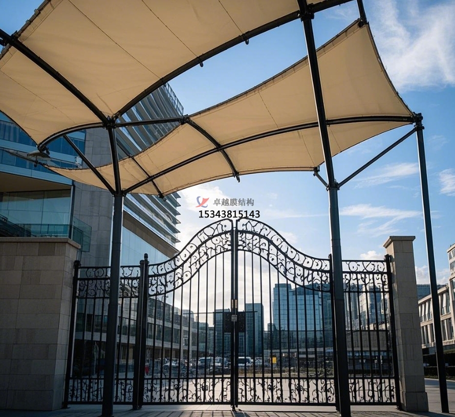 膜結(jié)構(gòu)大門還具備良好的遮陽功能。炎炎夏日,膜材能夠?yàn)榫用駬纹鹨黄鍥龅目臻g,無論是步行進(jìn)出小區(qū)的居民,還是在門口短暫停留等待的人員,都能免受烈日的炙烤。部分膜材具有一定的透光性,在遮陽的同時(shí),還能讓自然光適度透入,使大門內(nèi)部空間明亮舒適,避免因光線不足而產(chǎn)生的昏暗壓抑感。此外,膜結(jié)構(gòu)大門還可以根據(jù)需要設(shè)置一些附屬設(shè)施,如在大門兩側(cè)安裝宣傳欄,用于發(fā)布小區(qū)通知、活動(dòng)信息等,方便居民及時(shí)了解小區(qū)動(dòng)態(tài)。