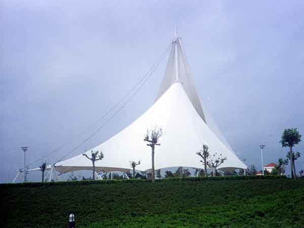 2、景觀膜結(jié)構(gòu)是目前發(fā)展很快的一種新型空間結(jié)構(gòu),是一種效率極高的張力集成體系,可以充分發(fā)揮鋼索的強(qiáng)度與張拉整體結(jié)構(gòu)的空間作用。它通過(guò)鋼骨架、鋼索與膜材共同受力形式穩(wěn)定曲面來(lái)覆蓋建筑空間,具有高度的形體可塑性和結(jié)構(gòu)靈活性,即通過(guò)對(duì)膜材內(nèi)部施加一定的預(yù)張力,使其具備了抵抗外荷載能力,從而充當(dāng)結(jié)構(gòu)材料的一種結(jié)構(gòu)體系。我公司先后在寧波地區(qū)承接了寧波新世界廣場(chǎng)景觀、寧波時(shí)代廣場(chǎng)景觀、寧波工業(yè)園區(qū)景觀小品的設(shè)計(jì)施工,簡(jiǎn)介如下: