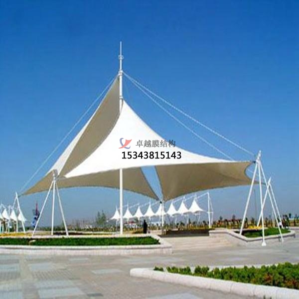膜結(jié)構(gòu)景觀的篷布采用PVC/PVDF/PTFE/ETFE,而膜材的特點是強度高、耐久性好、防火難燃、自潔性好,不受紫外線影響,使用壽命長,一般15-30年。具有高透光率,透光率為13%,對熱能反射率73%,熱吸收量很少。正是因為這種劃時代的膜材料的發(fā)明,使膜結(jié)構(gòu)景觀成為現(xiàn)代化的建筑。