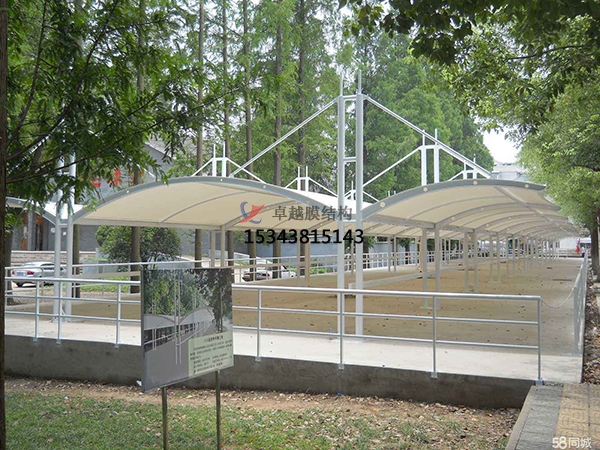 膜結(jié)構(gòu)車棚膜結(jié)構(gòu)所用的膜材料為具有、阻燃、耐久、自潔等特性的復(fù)合材料,一般由基布和涂層二部分組成。基布主要采用聚脂纖維或玻璃纖維絲編織而成,有平織和絞等多種編織方法,不同的膜結(jié)構(gòu)車蓬編織方法影響著膜材料的經(jīng)緯向力學(xué)性能指標(biāo),膜的抗拉強(qiáng)度和抗撕裂強(qiáng)度等;涂層材料主要有聚四氟乙烯和聚氯乙烯,在一定程度上提高了膜材料各項(xiàng)強(qiáng)度指標(biāo),為提高膜材料的耐久、自潔等特性,表面往往有一層氟涂層或硅涂層,膜材料的耐火、耐久及防水、自潔等性能,決定著膜材料的物理特性。