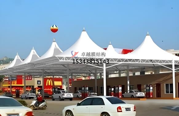 加油站張拉膜特點:造型美觀,透光性好,節(jié)能環(huán)保,抗震性強,施工便捷,經(jīng)濟性好。張拉膜結(jié)構(gòu)可通過獨特的曲面造型和豐富色彩,為加油站營造出現(xiàn)代、時尚的外觀,與周邊環(huán)境相融合,成為城市景觀的一部分。膜材具有較高的透光率,一般在 10%-20% 左右,部分可達 30% 以上,可提供自然采光,減少白天人工照明需求,節(jié)約能源。透光膜材可引入自然光減少照明能耗,結(jié)合自然通風設計降低空調(diào)使用率,材料可回收性符合綠色建筑標準,張拉膜具有良好的保溫隔熱性能,能有效降低加油站內(nèi)部能耗,配合節(jié)能照明設備,可實現(xiàn)綠色環(huán)保目標。自重輕、柔性大,在風荷載、雪荷載等外部荷載作用下,能通過變形分散荷載,具有良好的抗震性能,可抵抗 8 級地震。加油站膜結(jié)構(gòu)大部分構(gòu)件在工廠預制完成,現(xiàn)場組裝和安裝速度快,施工周期可比傳統(tǒng)建筑方式縮短一半以上,且對環(huán)境影響小,膜材料重量輕但強度高,降低支撐結(jié)構(gòu)負荷,安裝周期短,減少對加油站運營的影響。張拉膜結(jié)構(gòu)廣泛應用于加油站頂棚設計,覆蓋加油區(qū)和洗車區(qū)域,為車輛及人員提供遮陽、防雨、防雪的全天候保護。在高速公路服務區(qū)、城市主干道等車流量密集區(qū)域,部分加油站結(jié)合張拉膜結(jié)構(gòu)擴展服務功能,例如設置司機休息區(qū)、戶外餐飲區(qū)或小型便利店,通過靈活的空間布局提升用戶體驗,其高效覆蓋能力尤為突出。雖然膜材和鋼結(jié)構(gòu)等材料成本相對較高,但由于施工周期短、維護成本低,長期來看綜合成本具有優(yōu)勢,且使用壽命可達 15-30 年甚至更長。