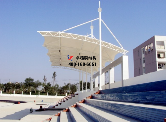 膜結(jié)構(gòu)看臺,周口體育場膜結(jié)構(gòu)看臺頂棚,膜結(jié)構(gòu)看臺雨棚,操場主席臺遮陽棚等張拉形式膜結(jié)構(gòu)的先行者是德國的奧托(F.Otto),他在1955年設(shè)計的張拉膜結(jié)構(gòu)跨度在25m左右,用于聯(lián)合公園多功能展廳。