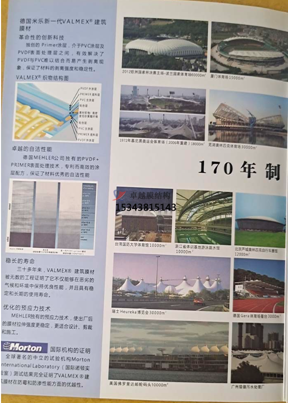 德國(guó)MEHLERHAKU米樂公司擁有165年(1837年一2003年)的制造業(yè)經(jīng)驗(yàn)。通過1S09001質(zhì)量體系認(rèn)證,所有產(chǎn)品均經(jīng)過嚴(yán)格的DIN德國(guó)工業(yè)標(biāo)準(zhǔn),以及各個(gè)國(guó)家的膜材工業(yè)標(biāo)準(zhǔn)。2002年,德國(guó)米樂公司獲聘為中華人民共和國(guó)建設(shè)部《索膜建筑結(jié)構(gòu)制品》行業(yè)標(biāo)準(zhǔn)編制委員成員。德國(guó)米樂的產(chǎn)品系列涵蓋環(huán)保等各種PVC膜材領(lǐng)域,包括:建筑工程、輕型結(jié)構(gòu)、廣告、遮陽、汽艇、軍用、裝飾、水利環(huán)保,等等。