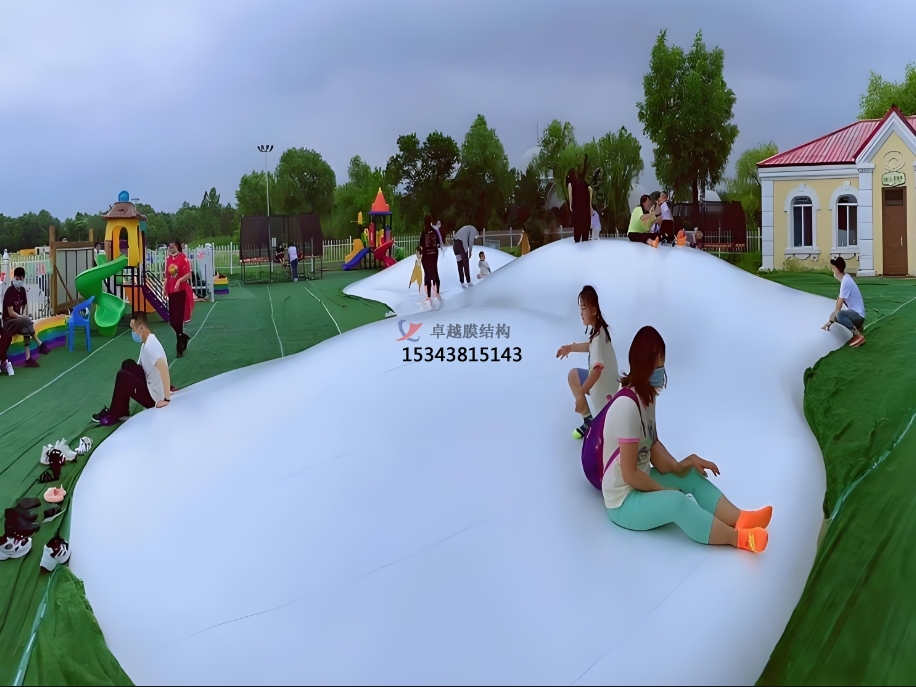 蹦蹦云的設(shè)計高度靈活,可根據(jù)場地環(huán)境定制形態(tài)與規(guī)模。無論是平坦空地還是起伏地形,均可通過設(shè)置沙坑、坡度或洞穴,塑造自然野趣的游樂場景。其純白外觀與云朵造型,既能融入景區(qū)生態(tài)景觀,也可作為商業(yè)地產(chǎn)的網(wǎng)紅打卡點。從親子樂園到度假村,從生態(tài)農(nóng)莊到特色小鎮(zhèn),蹦蹦云以 “可蹦、可滑、可躺” 的多維體驗,滿足全年齡段游客的互動需求。