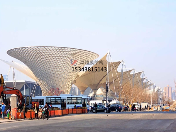 7、對邊角及有褶皺的區(qū)域進行局部張拉調(diào)節(jié),并更終固定膜面及節(jié)點;完成雨水系統(tǒng)安裝及防水覆蓋等;