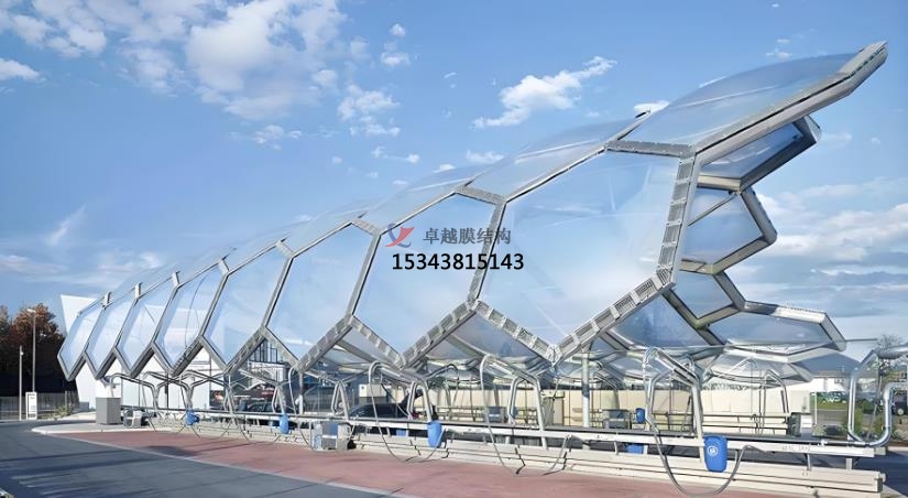 以下是膜結(jié)構(gòu)產(chǎn)品的主要應(yīng)用和特點(diǎn):膜結(jié)構(gòu)自行車棚和機(jī)動(dòng)車棚,膜結(jié)構(gòu)景觀,膜結(jié)構(gòu)污水池加蓋,膜結(jié)構(gòu)體育場(chǎng)館和展會(huì)建筑,膜結(jié)構(gòu)藝術(shù)裝置,膜結(jié)構(gòu)充電樁和收費(fèi)站。膜結(jié)構(gòu)自行車棚采用輕質(zhì)且堅(jiān)固的膜材料,具備優(yōu)異的抗風(fēng)、抗雨雪能力,同時(shí)具有自潔性,減少維護(hù)成本。其優(yōu)雅的造型和多樣的色彩選擇,使其成為城市中的一道靚麗風(fēng)景線,而機(jī)動(dòng)車棚的篷布采用PVC、PVDF、PTFE、ETFE等材料,具有高強(qiáng)度、耐久性好、防火難燃、自潔性強(qiáng)等特點(diǎn)。其透光率為13%,熱能反射率為73%,能有效減少熱吸收,使用壽命可達(dá)15-30年4。膜結(jié)構(gòu)景觀是一種耐用、高強(qiáng)度的涂層織物,具有柔韌的質(zhì)地、重量輕、透光性極佳等特點(diǎn),常被用于公園、廣場(chǎng)等場(chǎng)所,成為吸引眼球的藝術(shù)景觀。隨著工業(yè)污染的加劇,膜結(jié)構(gòu)污水池加蓋因其環(huán)保、施工簡(jiǎn)便等優(yōu)勢(shì),逐漸成為工業(yè)污水處理的首選。其鋼材料使用量少,能有效解決池體跨度過(guò)大的施工難題。膜結(jié)構(gòu)在體育場(chǎng)館和展會(huì)建筑中的應(yīng)用,不僅縮短了建設(shè)工期,降低了造價(jià)成本,還減少了環(huán)境污染。其大跨度的設(shè)計(jì)和高透光性,為場(chǎng)館提供了良好的采光和空間感。膜結(jié)構(gòu)藝術(shù)裝置設(shè)計(jì)簡(jiǎn)單、造型獨(dú)特,不僅具有藝術(shù)展示效果,還能為人們提供休息場(chǎng)所,廣泛應(yīng)用于公園、景區(qū)等場(chǎng)所。膜結(jié)構(gòu)充電樁和收費(fèi)站以其耐用性和美觀性,成為現(xiàn)代城市基礎(chǔ)設(shè)施的重要組成部分,為人們提供便捷服務(wù)的同時(shí),也大大提升了城市形象。