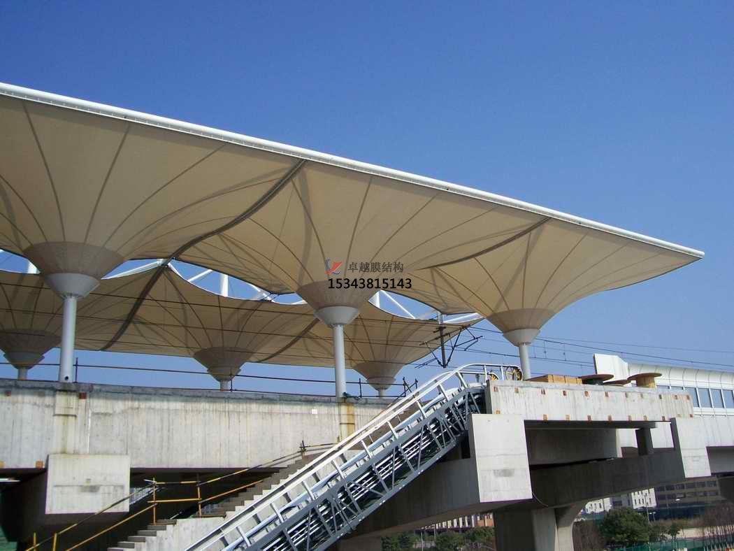 優(yōu)質(zhì)的膜結(jié)構(gòu)雨棚具有一定自潔功能,空氣中的灰塵通過雨水的沖刷就能潔白如新。