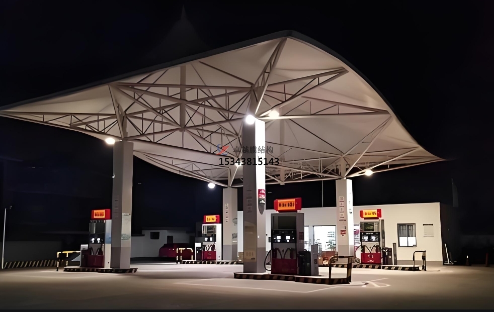 傳統(tǒng)加油站:在傳統(tǒng)加油站建設(shè)中,膜結(jié)構(gòu)頂棚已成為主流選擇。其卓越的耐候性和自潔性能,能始終保持加油站外觀整潔;良好的透光性?xún)?yōu)化了室內(nèi)照明條件,提升加油作業(yè)效率;堅(jiān)固的結(jié)構(gòu)設(shè)計(jì)確保了設(shè)施的耐用性和安全性,為加油站的長(zhǎng)期穩(wěn)定運(yùn)營(yíng)提供有力保障。