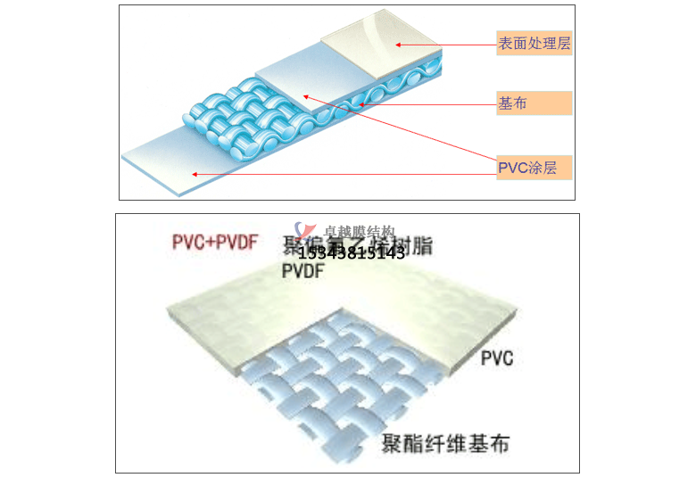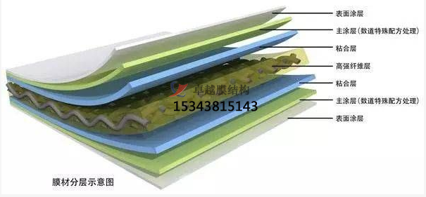 PVDF膜材加工是在聚酯纖維基布上涂上Pv(聚氬乙烯)樹酯后加上100%PVDF(聚偏氟乙烯)表面涂層而成的復(fù)合材料。PVDF膜權(quán)由于自潔性良好、價(jià)格適中、運(yùn)輸安裝方使,更廠泛應(yīng)用于各類建筑領(lǐng)域。它的壽命因不同的表面涂層而異,一股可達(dá)成10-25年,其構(gòu)造形式見下圖:
