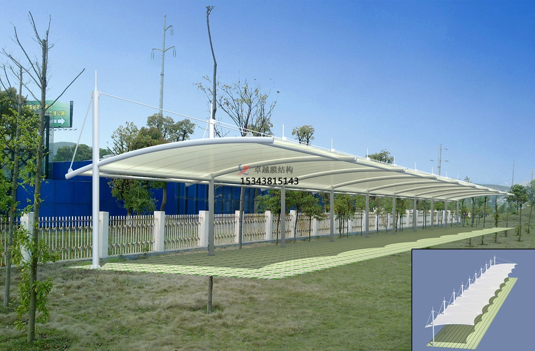 膜結構停車場性能優(yōu)勢:膜結構停車場具有透光性好、隔熱性佳、自潔性強、抗震性強、防水性優(yōu)等特點。其中透光性好,是因為膜材具有一定的透光率,能使自然光線透過,形成柔和的漫射光,不僅可以節(jié)約白天的照明能源,還能提高停車場內的視覺舒適度,減少照明設備的使用,降低能耗。隔熱性佳,優(yōu)質的膜材具有良好的隔熱性能,能有效阻擋太陽輻射熱,降低停車場內的溫度,減少車輛因高溫而產(chǎn)生的損耗,同時也為停車者提供更舒適的環(huán)境。自潔性強,膜材表面通常加涂有防護涂層,如聚氟乙烯、丙烯酸等,這些涂層具有不發(fā)粘、耐高溫的特點,落到膜材表面的灰塵可以靠雨水的自然沖洗而達到自潔的效果,使停車場保持整潔美觀??拐鹦詮?,膜結構具有良好的彈性和柔韌性,在地震等自然災害發(fā)生時,能夠通過自身的變形來吸收和耗散能量,有效抵抗地震力,保障停車場的結構安全和車輛的停放安全。防水性優(yōu),膜材本身具有優(yōu)異的防水性能,拼接處經(jīng)過專業(yè)處理,能有效防止雨水滲透,為車輛提供可靠的遮雨保護,避免車輛遭受雨水侵蝕。