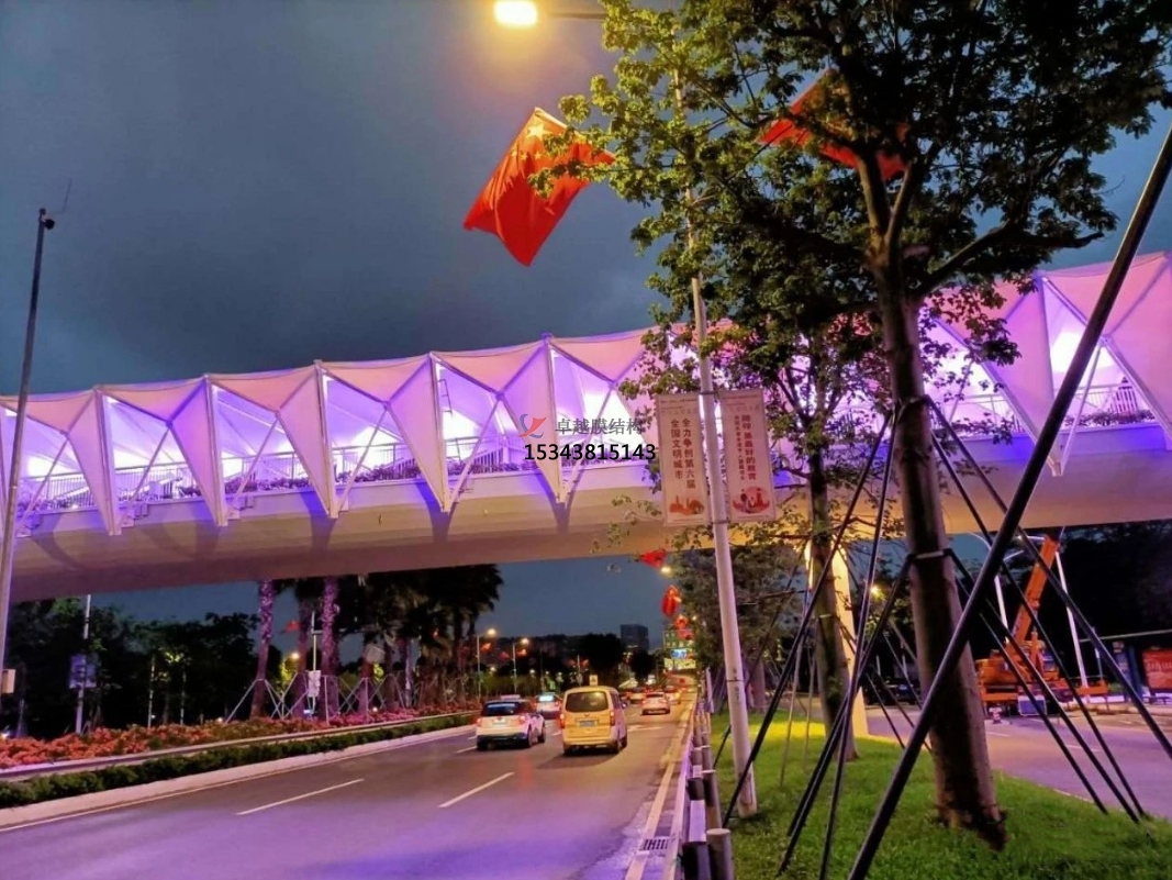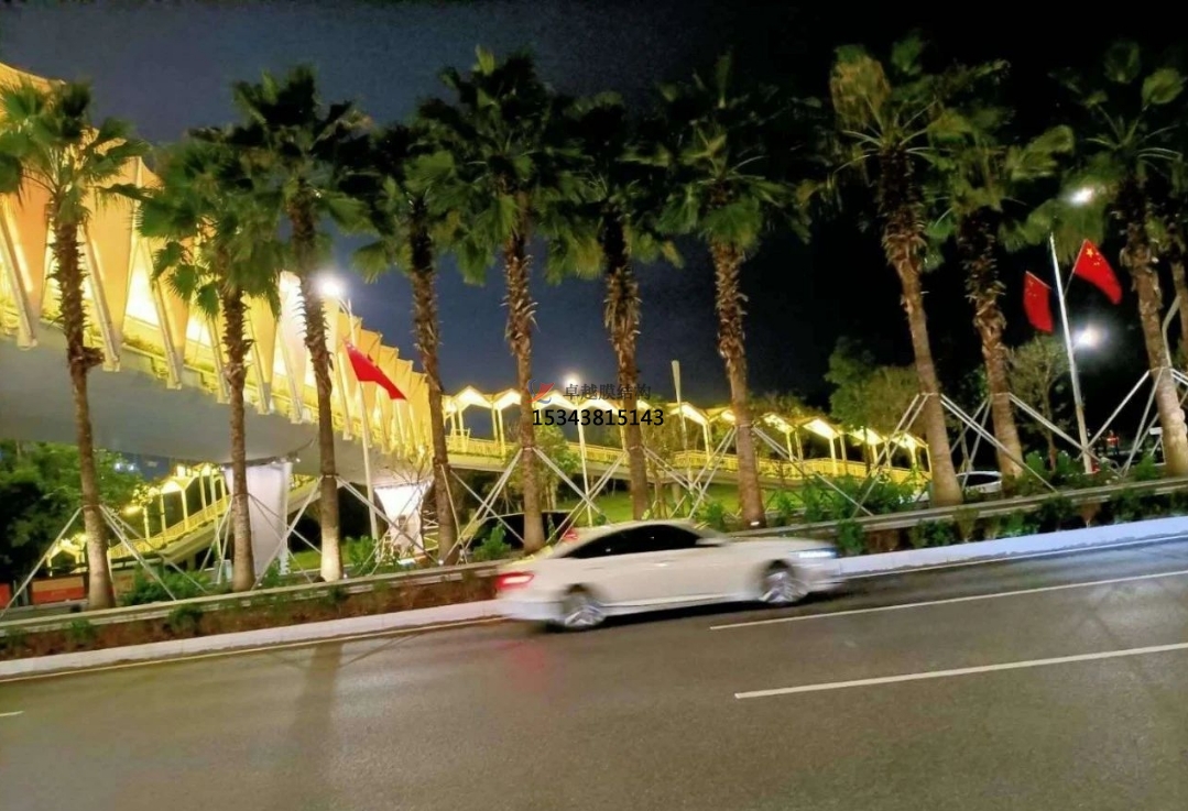 為了保質(zhì)、保量、保證工期、保安全的情況下順利的把項(xiàng)目交到業(yè)主手中,把施工人員分成兩班晝夜不分,日夜加班,還要克服現(xiàn)場的高溫,施工節(jié)點(diǎn)的困難,而且每片膜材的尺寸也不相同,為了膜材裁剪精準(zhǔn),設(shè)計(jì)師每跨每跨的量尺寸,又復(fù)合尺寸,確保了天橋立面膜結(jié)構(gòu)的安裝工程順利進(jìn)行。