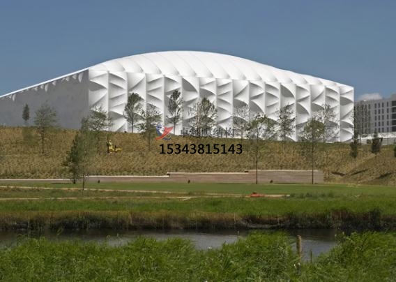 場館高30m,面積兩萬平方米,外敷可收回PVC膜,膜在后面的結(jié)構(gòu)的效果下構(gòu)成美麗的崎嶇。透光的外表皮能夠使得場館在白天能夠十分少的依賴人工照明。
