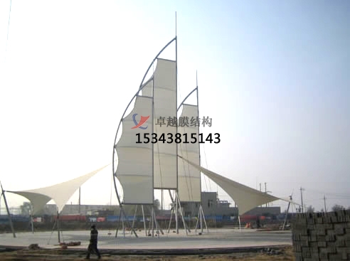 膜結(jié)構(gòu)景觀工程規(guī)??纱罂尚?,有街頭小品,也有候機(jī)大廳、體育場;壽命可長可短,可以是臨時性展篷,也可以是30年以上的長期建筑;色彩可素可花,膜材料像布一樣可以染成各種花色,尤其是膜材料的半透明性能,使夜空中的膜建筑在燈光照射下,呈現(xiàn)出夢幻般的色彩。