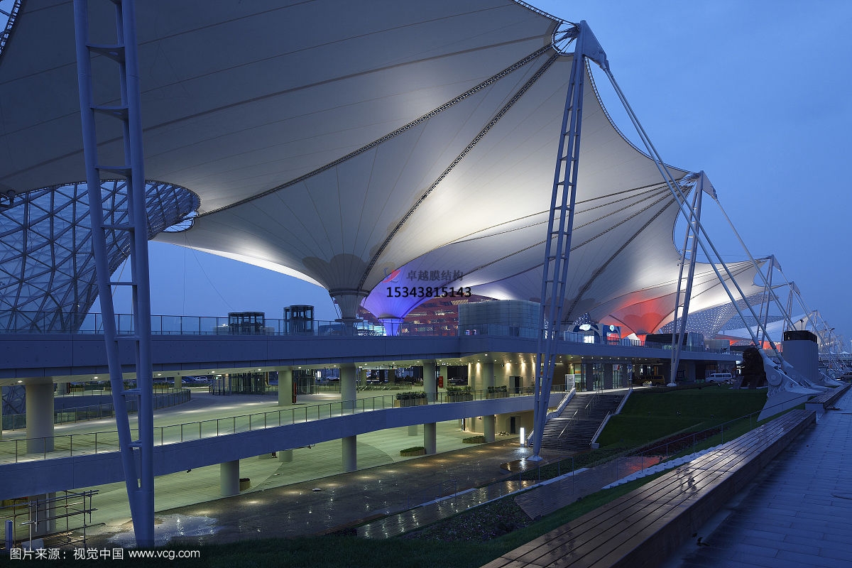 (2 )輕巧而美觀的膜結(jié)構(gòu)用于敞開或半敞開建筑物的遮蔽屋蓋尤為適宜。近年來在足球、田徑等比賽的體育場中,越來越多的看臺挑蓬都采用膜結(jié)構(gòu)。國外很多露天劇院的舞臺、博覽會的展覽館也都以膜材作為頂蓋。在我國廣大地區(qū)的農(nóng)貿(mào)市場也可大力推廣膜結(jié)構(gòu)。
