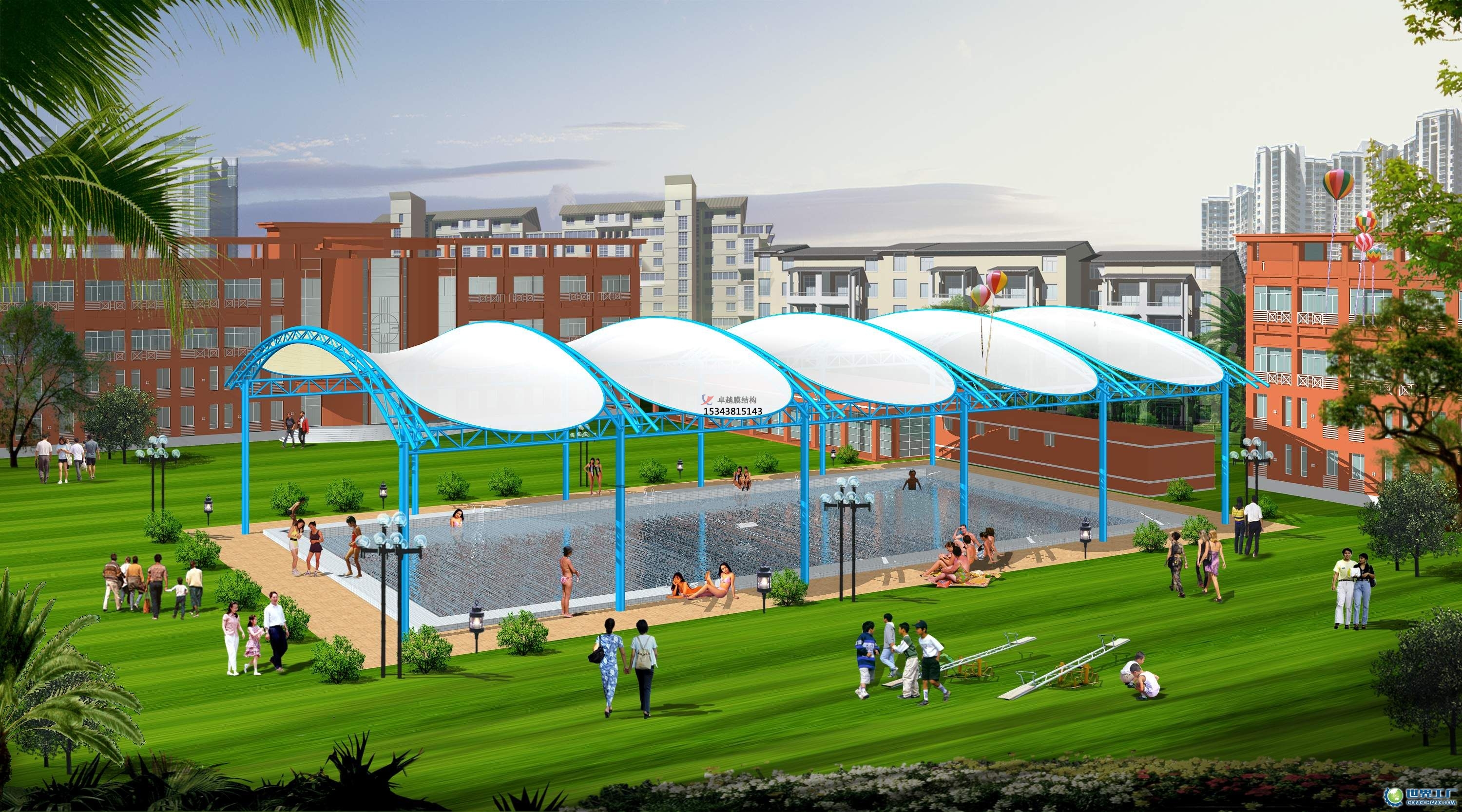 膜結(jié)構(gòu)以多重結(jié)合的情況下使用,以高強度柔性薄膜材料與輔助的結(jié)構(gòu)材料通過一定的設(shè)計方式而產(chǎn)生的空間形狀,既覆蓋結(jié)構(gòu),又體現(xiàn)了美度。