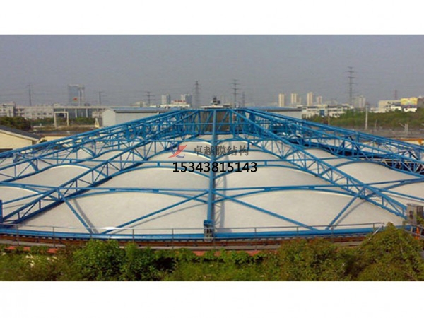 索膜結(jié)構(gòu)污水池結(jié)構(gòu)形式:其結(jié)構(gòu)形式有反吊膜結(jié)構(gòu)、懸索結(jié)構(gòu)和充氣膜結(jié)構(gòu)(無骨架式)三種。其中,反吊膜結(jié)構(gòu)的原理是以外部鋼構(gòu)為支撐骨架,將抗腐蝕性強(qiáng)的膜材(如氟碳纖維膜)反吊覆蓋于污水池上方,使膜材與腐蝕性氣體隔離,保護(hù)鋼構(gòu)不受侵蝕,適用于造紙廠、化工廠、市政污水處理廠等腐蝕性環(huán)境;懸索結(jié)構(gòu)的特點(diǎn)是利用柔性拉索調(diào)節(jié)膜面張力,無需內(nèi)部骨架,材料用量少且工期短,局限性是其僅適用于特定跨度的池體,靈活性較低;充氣膜結(jié)構(gòu)(無骨架式)的工作原理是通過內(nèi)部空氣壓力支撐膜面,形成大跨度無立柱空間,適用于超大池體(如200米以上跨度),優(yōu)勢是可增設(shè)門窗,便于設(shè)備檢修。