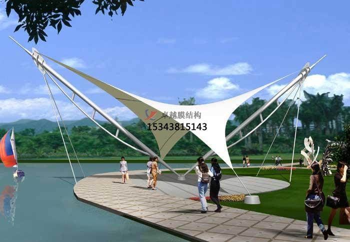 張拉膜景觀是一種建筑與結(jié)構(gòu)完美結(jié)合的結(jié)構(gòu)體系;它是用高強(qiáng)度柔性薄膜材料與支撐體系相結(jié)合形成具有一定剛度的穩(wěn)定曲面,能承受一定外荷載的空間結(jié)構(gòu)形式;這種結(jié)構(gòu)形式特別適用于大型體育場館、人口廊道、小品、公眾休閑娛樂廣場、展覽會場、購物中心等領(lǐng)域。