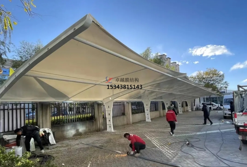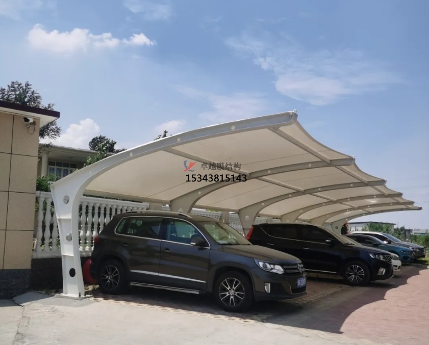 7字型膜結(jié)構(gòu)車棚在造價方面具有一定的優(yōu)勢。一方面,膜材本身的成本相對合理,而且由于其自重輕,對支撐結(jié)構(gòu)的要求相對較低,從而在一定程度上降低了整個車棚的建設(shè)成本。另一方面,其施工周期較短,可以更快地投入使用,減少了建設(shè)過程中的時間成本和間接成本。