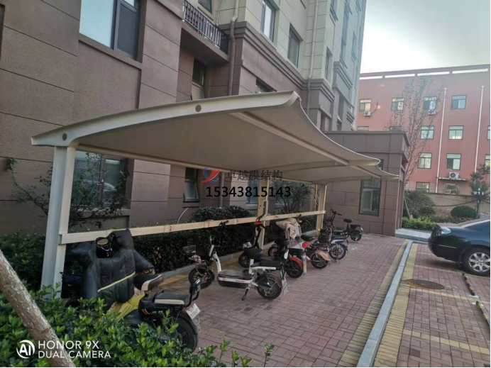 膜結(jié)構(gòu)材料具有良好的可塑性,能夠呈現(xiàn)出流暢的曲線和獨(dú)特的造型。對于7字型車棚而言,膜材可以根據(jù)設(shè)計要求形成優(yōu)美的坡面和線條,與周邊的建筑和環(huán)境相融合。它可以是簡潔現(xiàn)代的風(fēng)格,展現(xiàn)出科技感和時尚感;也可以是富有藝術(shù)氣息的設(shè)計,成為整個區(qū)域的視覺焦點(diǎn),為原本單調(diào)的停車區(qū)域增添一份美感。