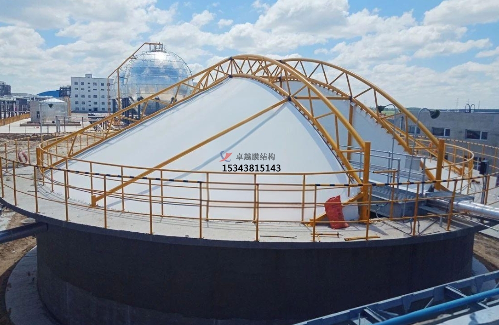 污水池反吊膜,顧名思義,是一種將薄膜材料以反吊的方式覆蓋在污水池上方的結(jié)構(gòu)。這種結(jié)構(gòu)通過鋼架或索網(wǎng)等支撐體系,將膜材料緊繃并固定于污水池上方,形成一個(gè)密閉或半密閉的空間,有效隔絕污水池內(nèi)的惡臭氣體和有害物質(zhì),防止其對外擴(kuò)散,同時(shí)保護(hù)膜材料免受污水池內(nèi)腐蝕性氣體的侵蝕。