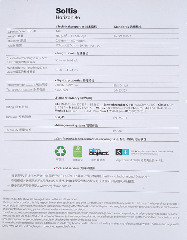 紗帝飾:紗帝飾面料為抵擋熱量和光線的真正盾牌,依靠其微型通風結構,調節(jié)陽光的熱效應,有效地防眩目。紗帝飾面料具有46種顏色,可為所有建筑,無論是 公眾場合還是私人住宅提供配套的眾多色彩和多種用途。法拉利預應力專利制造技術給紗帝飾織物帶來尺寸恒定,不會變形,無需加固自然抗撕拉,耐久和抗塵,占 地面積小等獨有特性,更顯出紗帝飾面料對建筑物技術性遮陽無可匹敵的優(yōu)勢。