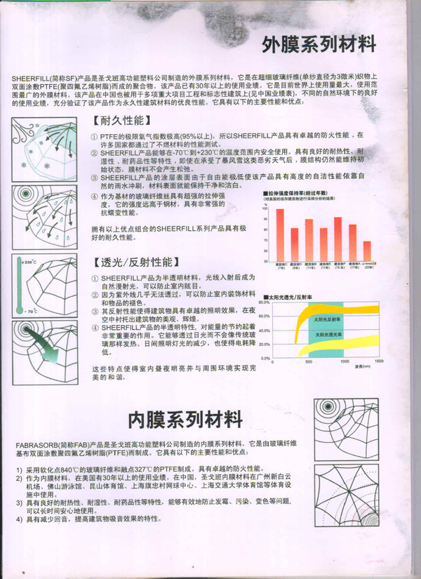 SHEERFILL產(chǎn)品能夠在-70C到+230C的溫度范團(tuán)內(nèi)安全使用。具有良好的耐熱性、耐濕性、耐藥品性等特性,即使在承受了暴風(fēng)雪這類惡劣天氣后,膜結(jié)構(gòu)仍然能維持初始狀態(tài),膜材料不會產(chǎn)生松弛。